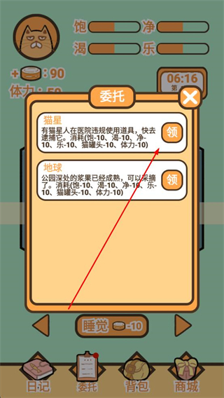 2、點擊委托按鈕進入委托界面,查看布置掃地等委托任務,點擊對應的領按鈕領取任務獎勵,消耗對應的體力數值。
