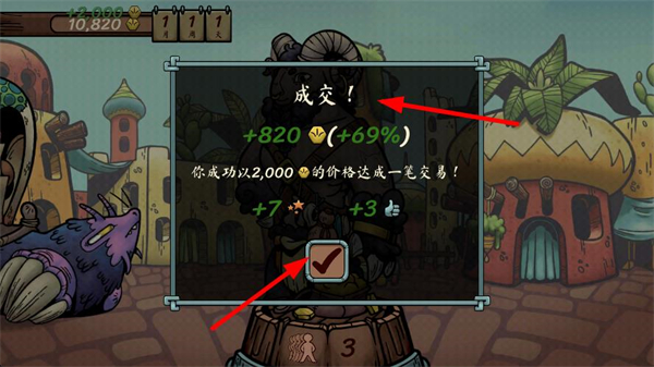 3、交易達成后會顯示成交提示,可看到獲得的金幣與加成獎勵,點擊對勾按鈕關閉提示,完成本次交易流程。