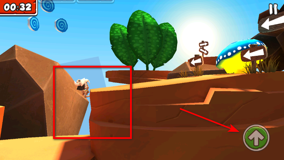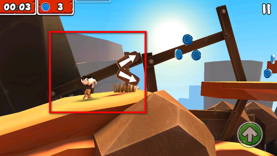 2、遇地形落差時點擊向上按鈕,幫助角色跳躍過缺口,繼續向箭頭指引區域移動,避免掉落以順利抵達目標位置。