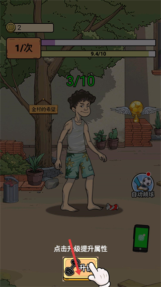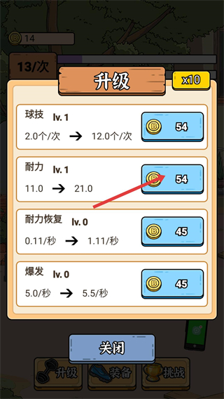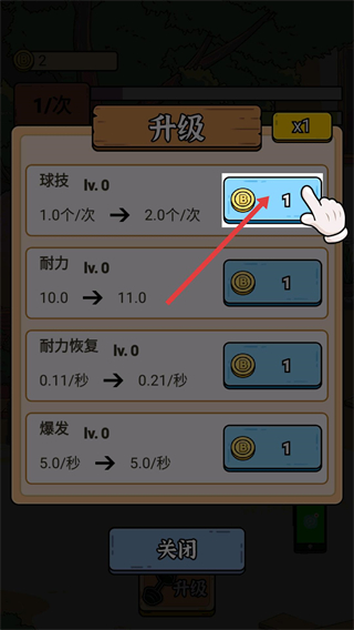 3、消耗1個金幣升級球技,可將單次顛球的金幣收益1提升至2,優先強化收益類屬性能快速積累更多資源。