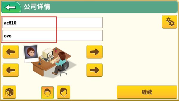 2、在公司詳情界面,可見ac810ovo等標識,界面配有左右箭頭按鈕與人物相關展示區域,完成當前界面操作后點擊繼續,推進公司經營流程。