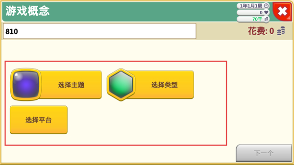 3、進入游戲概念,界面顯示810標識及花費信息,可通過選擇主題選擇類型選擇平臺按鈕確定游戲核心設定,點擊下一個推進開發流程。