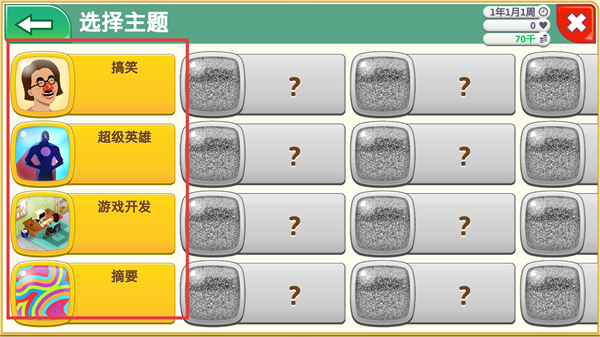 4、進入選擇主題界面,能看到搞笑超級英雄游戲開發摘要等可選主題,部分主題暫未解鎖顯示為問號,選擇合適主題助力游戲的創意構思。