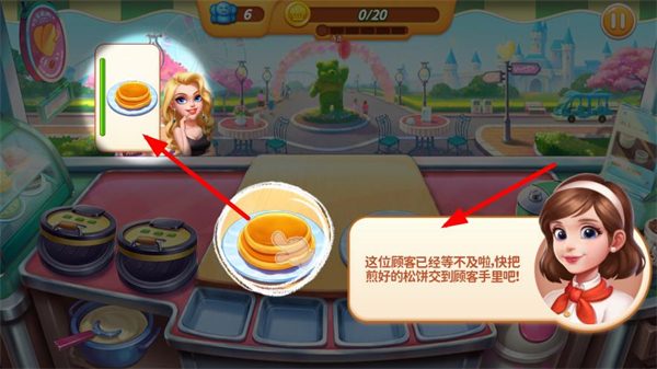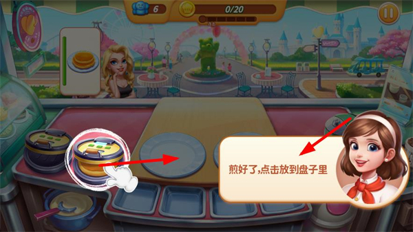 3、松餅煎好后點擊將其放到盤子里,完成松餅從鍋到盤的轉移,這是制作流程的關鍵步驟,讓松餅處于可交付狀態。