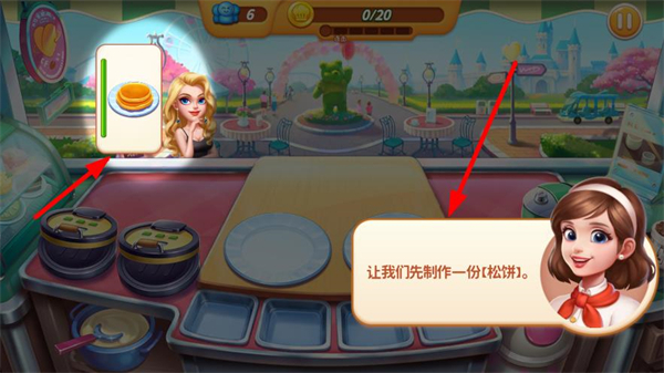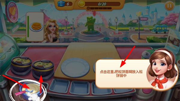 2、點擊松餅面糊并放入松餅鍋里,按界面指引操作,完成面糊入鍋的步驟,為后續煎制松餅做準備,推進制作進程。