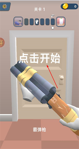 2、進入關卡1界面,看到霰彈槍道具及點擊開始提示,點擊對應區域,開啟當前關卡的游戲流程。