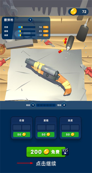 4、完成射擊后進入武器升級界面,看到傷害重量等升級選項,可選擇升級屬性,點擊繼續按鈕推進后續游戲流程。
