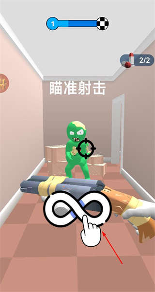 3、進入射擊環節,界面顯示瞄準射擊提示,瞄準出現的綠色僵尸,按照指引進行射擊操作,推進關卡進度。
