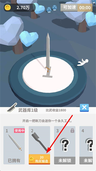 4、武器庫界面可消耗金幣鍛造新刀,開啟新刀會獲得永久工人,工人能助力后續獲取資源,提升武器庫等級可增加比武收益。
