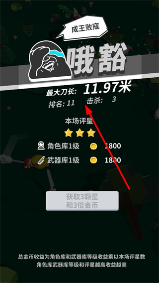 3、對局結束后會展示本場最大刀長、排名和擊殺數,還能獲得評星與金幣獎勵,評星越高,結合角色庫和武器庫等級的收益越多。