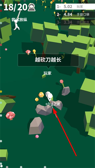 1、游戲持續砍擊場景里的巖石等物體,刀長會不斷增加,界面會顯示每次砍擊提升的數值,同時上方能看到自己玩家中的排名。