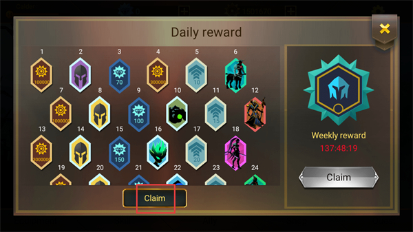 1、進入每日獎勵界面,可看到不同日期對應的各類獎勵,右側顯示每周獎勵的數值,點擊Claim按鈕,即可領取對應的每日獎勵內容。