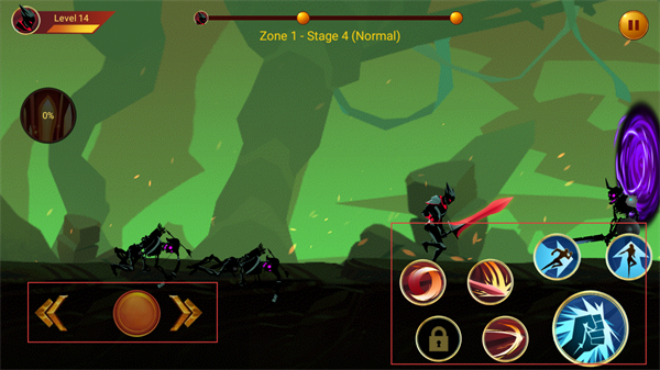 2、處于Normal關卡,等級為14,左側方向鍵控制角色移動,右側有多個技能按鈕,部分處于鎖定狀態,可使用解鎖技能參與戰斗。