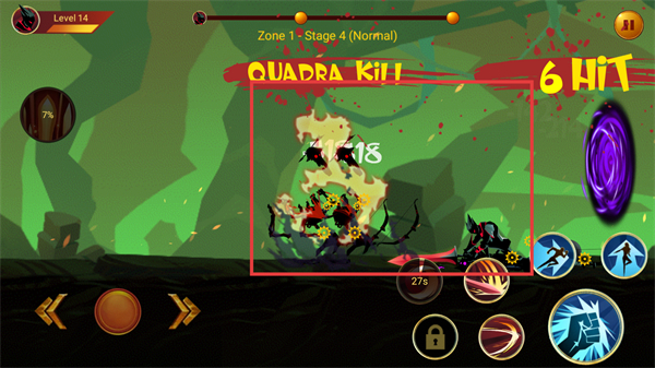 3、戰斗過程中會出現QUADRA KILL提示與6HIT標識,同時顯示傷害數值,操控角色釋放技能,擊敗當前敵人推進關卡進程。