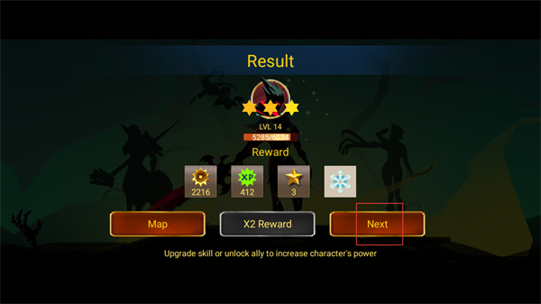 4、關卡結束后進入Result界面,顯示五星評價及對應獎勵內容,點擊Next按鈕,即可進入下一個關卡繼續進行游戲挑戰。