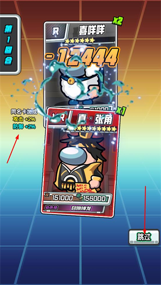 3、戰斗過程中留意同名卡牌的加成效果,合理釋放角色技能,可點擊跳過按鈕加快戰斗節奏,爭取多回合取勝。