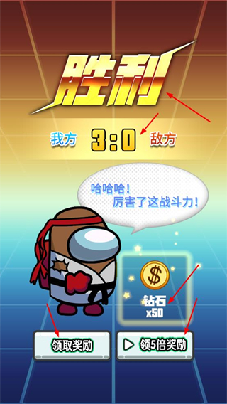 4、戰斗勝利后可選擇看視頻領取5倍獎勵,也可直接領取鉆石、金幣,所得資源可用于升級卡牌提升整體戰力。