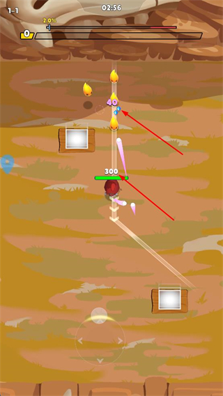 2、遇火焰敵人,控制角色移動,利用攻擊機制反擊,躲避傷害,收集掉落的藍色道具。