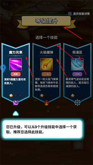 4、升級時選技能,魔力光束單體強、火焰魔彈帶燃燒、低溫區控場,按需挑,增強戰力。