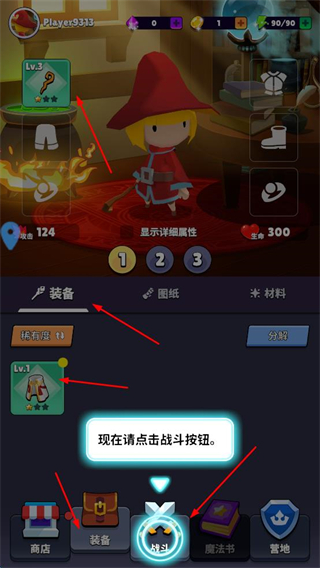 1、在裝備界面,點擊武器、防具圖標,穿戴/更換裝備,提升攻擊、生命屬性,再點戰斗出發。