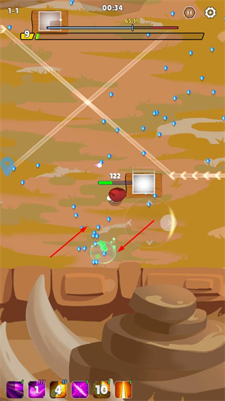 2、戰斗時控制角色移動,躲避敵人攻擊,拾取藍色晶體,積累資源,釋放技能清怪推進關卡。