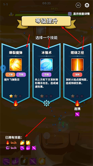 3、升級選技能,爆裂魔彈增飛彈、冰錐術減速、燃燒之徑持續傷,根據戰斗風格,挑適配技能。