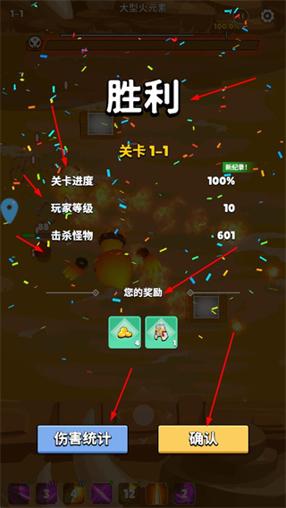 4、勝利后看關卡進度、等級、獎勵,點擊確認領金幣、裝備,用傷害統計分析戰斗數據。