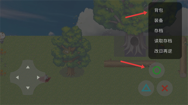 3、擊敗小羊hou,點擊對應按鈕可打開功能菜單,包含背包、裝備、存檔等選項,用于管理物品、保存讀取游戲進度。