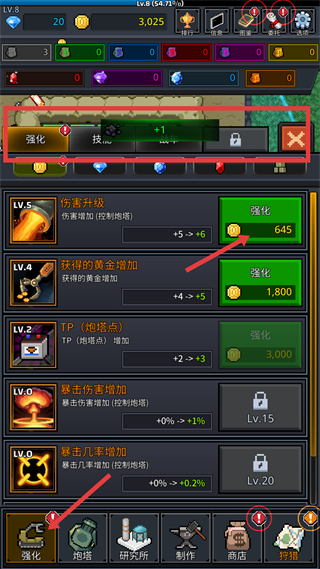 1、進入強化界面可升級傷害、黃金獲取、炮塔點等屬性,升級需消耗對應金幣,優先升級傷害提升炮塔輸出,合理分配金幣提升戰力。