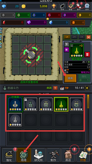2、切換到炮塔界面,可選擇已擁有的炮塔進行放置,放置后會消耗對應TP點數,不同炮塔有不同屬性與特殊效果,合理布置炮塔增強防御。