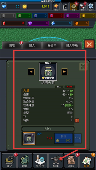 4、進入制作界面可查看炮塔的詳細屬性,制作新炮塔需收集對應碎片并消耗金幣,不同炮塔有等級上限,積累碎片與金幣制作高星炮塔提升總戰斗力。