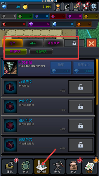 3、研究所界面可通過符文發掘獲取屬性符文,符文能提升傷害、暴擊等能力,購買符文需消耗鉆石,也可切換符文類型,解鎖更多符文來強化屬性。