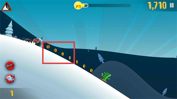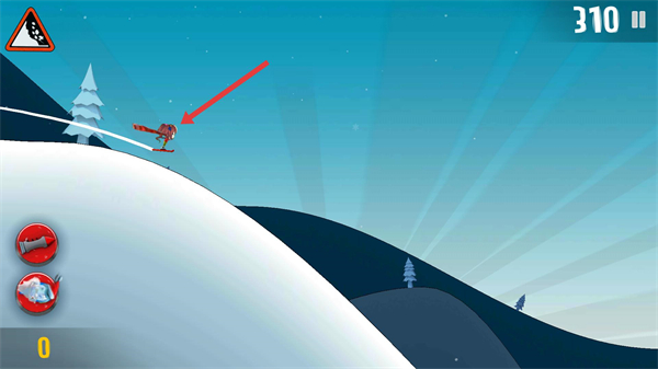 2、進入滑雪關卡,操控角色在雪坡滑行,左側有技能按鈕,頂部顯示當前得分,需控制角色躲避障礙。