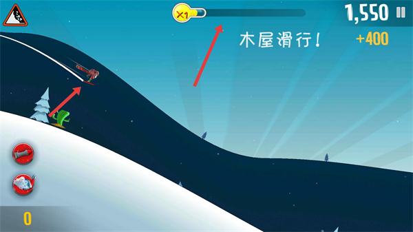 3、滑行中觸發【木屋滑行】事件,得分增加400,頂部進度條推進,此時需繼續控制角色方向。