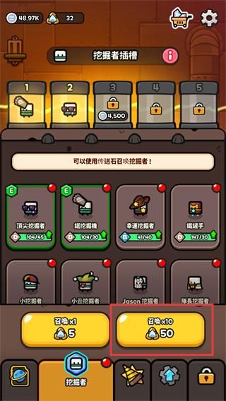 1、界面呈現挖掘者插槽,部分插槽需解鎖,可使用巖石召喚挖掘者,還有召喚1或10次的按鈕,消耗對應道具獲取不同類型的挖掘者。