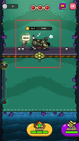 3、進入挖掘場景,能看到挖掘設備的等級及進度,界面設有JUMP和FEVER按鈕,操作這些按鈕控制設備開展地下挖掘冒險。