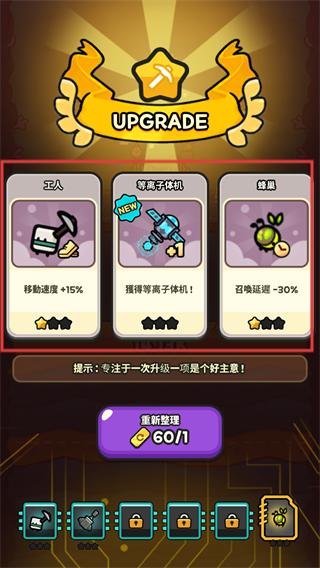 4、可選擇工人等離子體機等選項升級,不同選項對應不同屬性提升,還能消耗道具點擊重新整理更換升級選項。