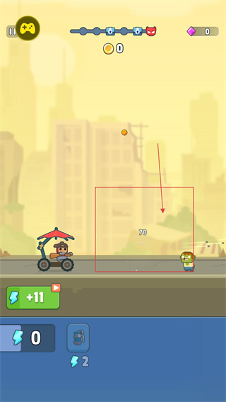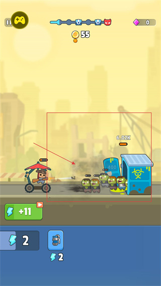 2、進入關卡后,角色自動攻擊喪尸,擊敗喪尸可獲得金幣,優先集火單個目標快速清理,同時收集掉落的金幣資源。