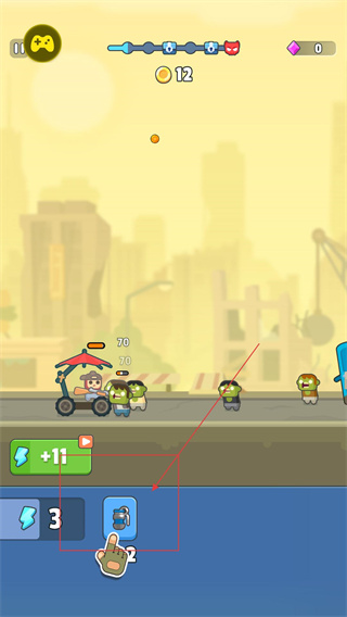 3、當喪尸靠近時,點擊下方的道具按鈕使用支援道具,可快速壓制集群喪尸的攻勢,避免角色被圍攻,,為后續強化做準備。