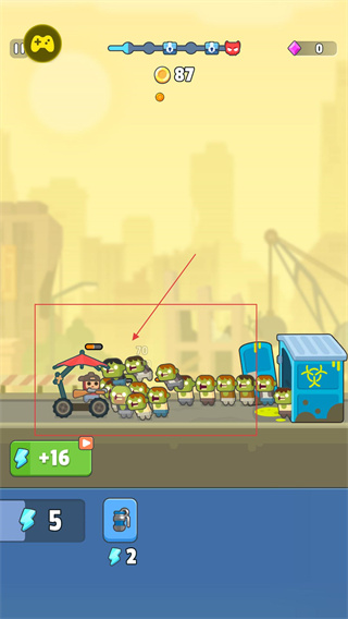 3、進入關卡后,角色依托載具攻擊喪尸,優先集火單個低血量目標快速清理,避免被集群圍攻,同時收集掉落的金幣。