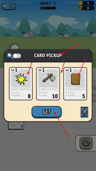 3、擊敗怪物后進入卡牌拾取環節,從三張可選卡牌里,結合卡牌等級、數值及自身戰斗需求挑選,選定后點擊GET按鈕獲取卡牌。
