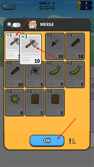 4、合并界面內,將兩張等級、類型均相同的卡牌拖動至一處完成合并,可提升卡牌等級與戰力,合并操作完成后點擊OK確認生效。
