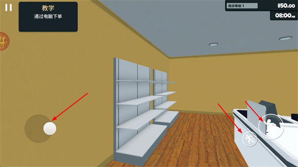 2、處于教學場景時,按照界面指引操控虛擬搖桿移動角色,靠近收銀臺等核心設備,點擊對應交互按鈕,掌握基礎的場景交互方式。
