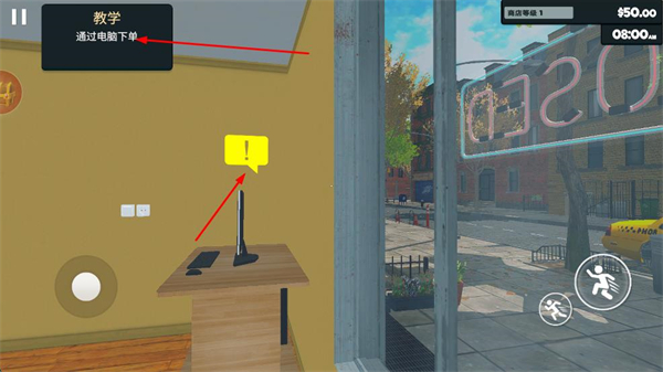 3、跟隨游戲內的教學提示,定位帶有感嘆號標識的電腦設備,該設備是觸發下單教學任務的關鍵,靠近后點擊交互觸發任務。