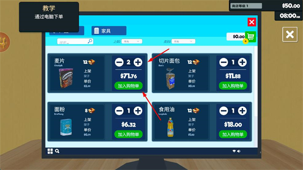 4、在電腦操作界面中,找到彈出的商品列表,按教學指引選定切片面包等商品,點擊加入購物單按鈕,完成下單流程的學習操作。
