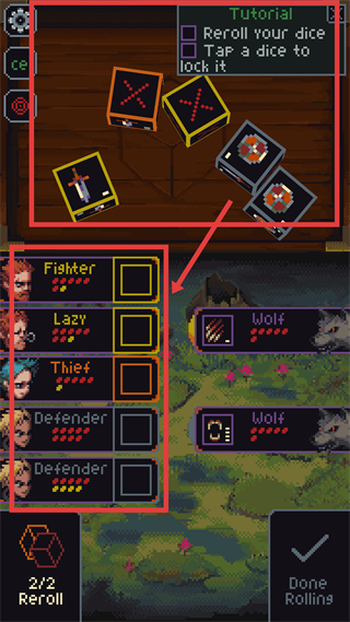 3、戰斗界面上方會擲出功能骰子,點擊骰子可鎖定想要的效果,再將骰子效果分配給下方的英雄,以此為英雄賦予攻擊、防御等戰斗能力。