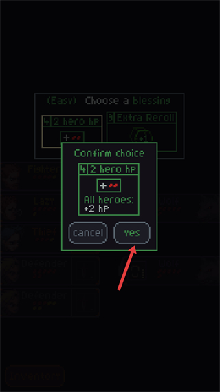 2、選擇難度后進入祝福選擇界面,可看到不同的增益選項,選中祝福后點擊yes按鈕確認選擇,即可為所有英雄增加生命值,提升初始生存能力。