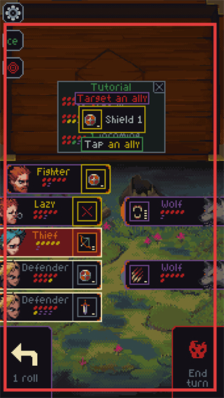 4、分配骰子效果后,可根據提示例如將護盾類效果指定給盟友英雄,完成效果配置后點擊End turn按鈕結束回合,即可觸發戰斗讓英雄與敵人進行交互。