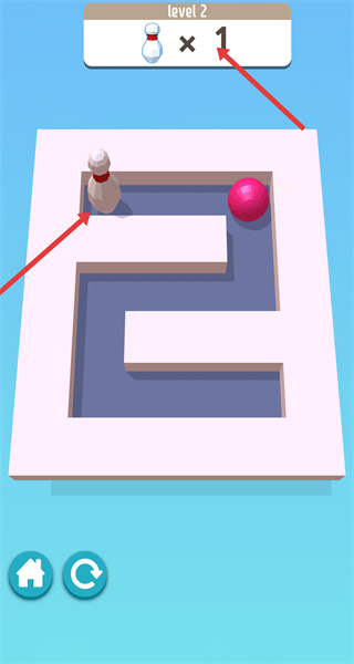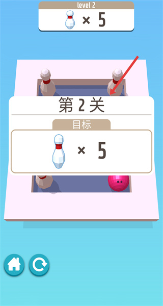 1、進入關卡后,查看當前關卡的目標,明確需要擊倒的保齡球瓶數量,隨后觀察保齡球和球瓶的位置分布,準備規劃保齡球的滾動路徑。