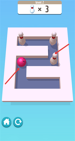 3、繼續引導保齡球在軌道內行進,逐步擊倒剩余的球瓶,直到達成關卡要求的目標數量,過程中需適應軌道的彎折變化,保持保齡球的移動方向。